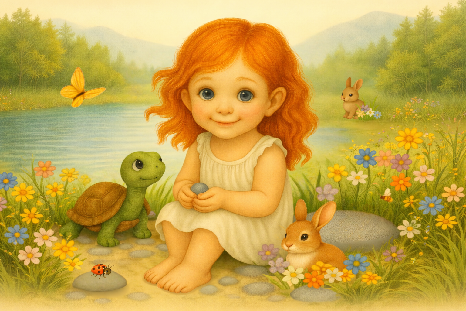 Tilly the Firefly appears in Little Bunny’s story. The Moon watches over the night in two books. Penelope — the little red-haired girl — moves quietly through more than one story. Toby the Turtle shows up in Safe Inside Her Shell, just living his life. Every familiar face is a small gift for the child who has been paying attention.
