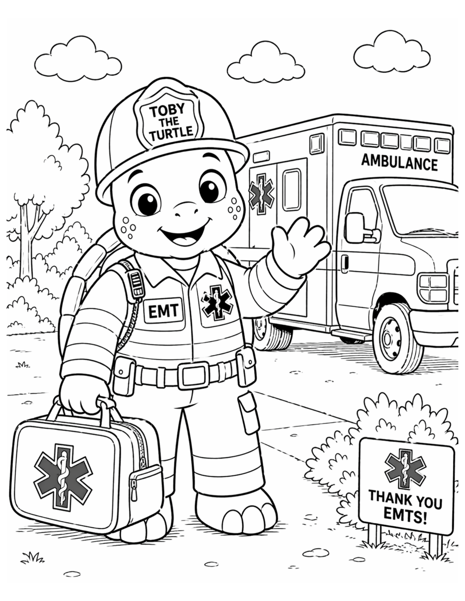 Hand a child a coloring sheet of the person standing right in front of them — police officer, firefighter, or EMT. An immediate connection tool that gives little hands something to do while the adults figure out what comes next.