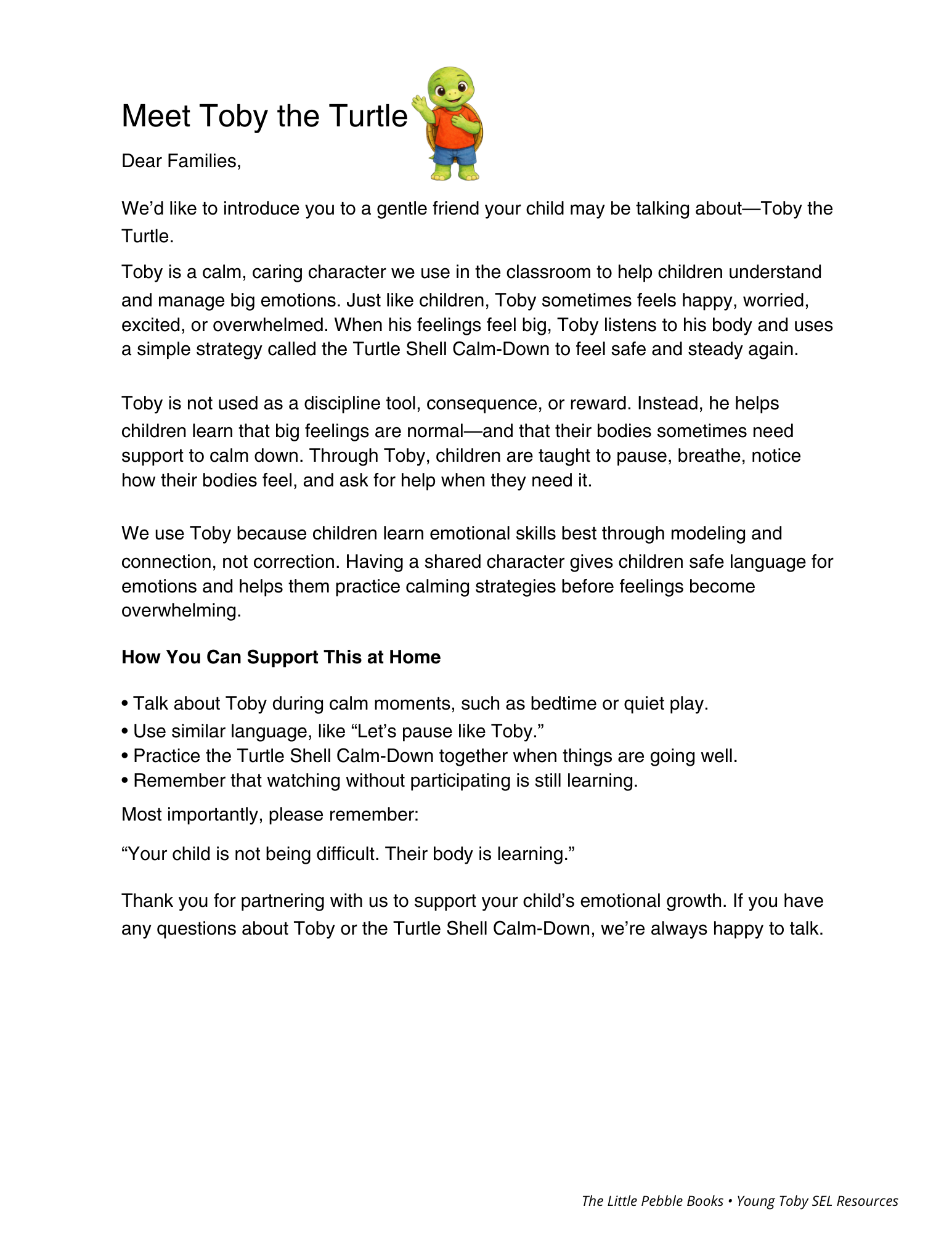 A ready-to-send letter introducing The Little Pebble Books to families — explains the characters, tools, and how to use them at home.