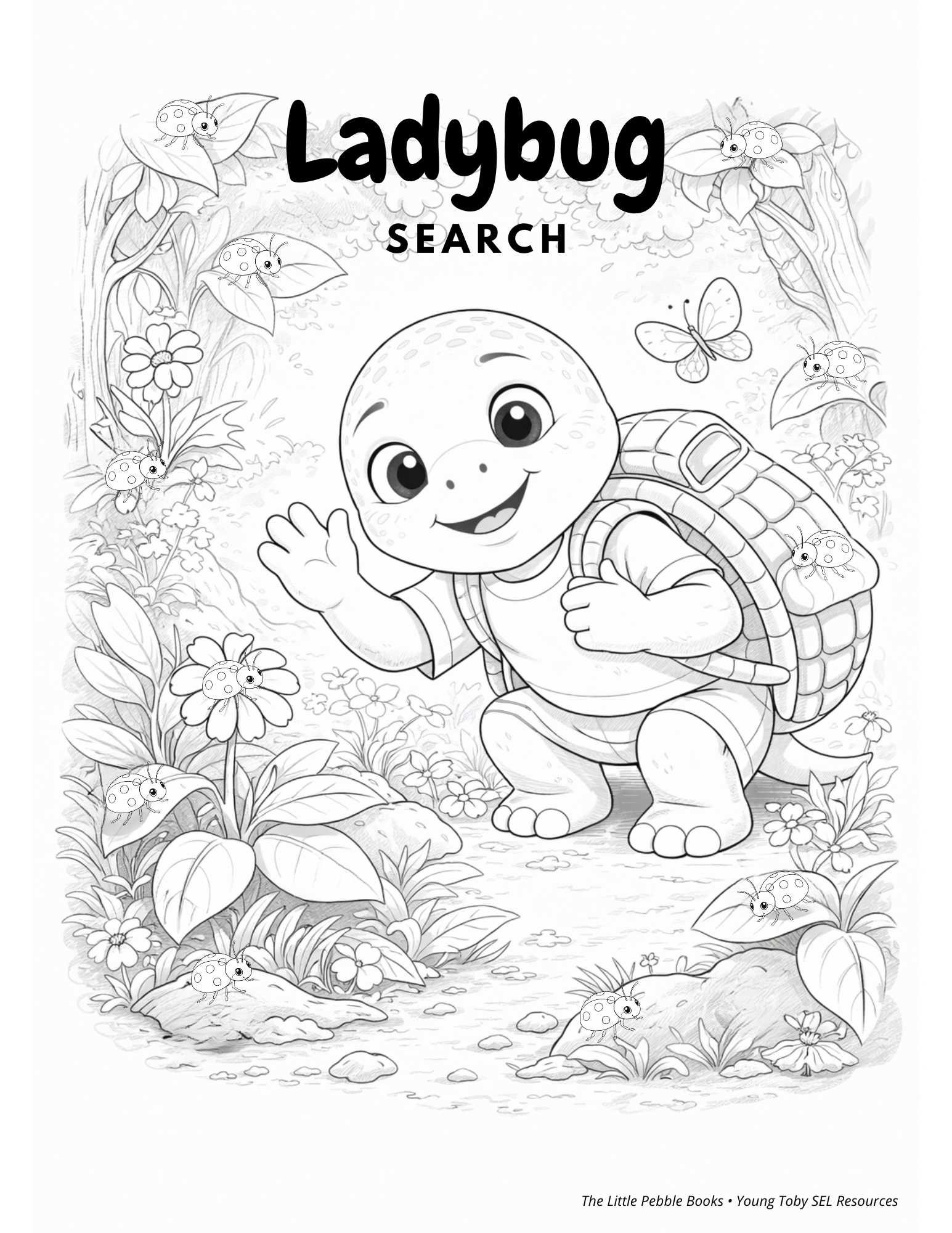 The ladybug is hiding somewhere in every Little Pebble Book. Can you find her? Color the scene and circle where she is hiding.