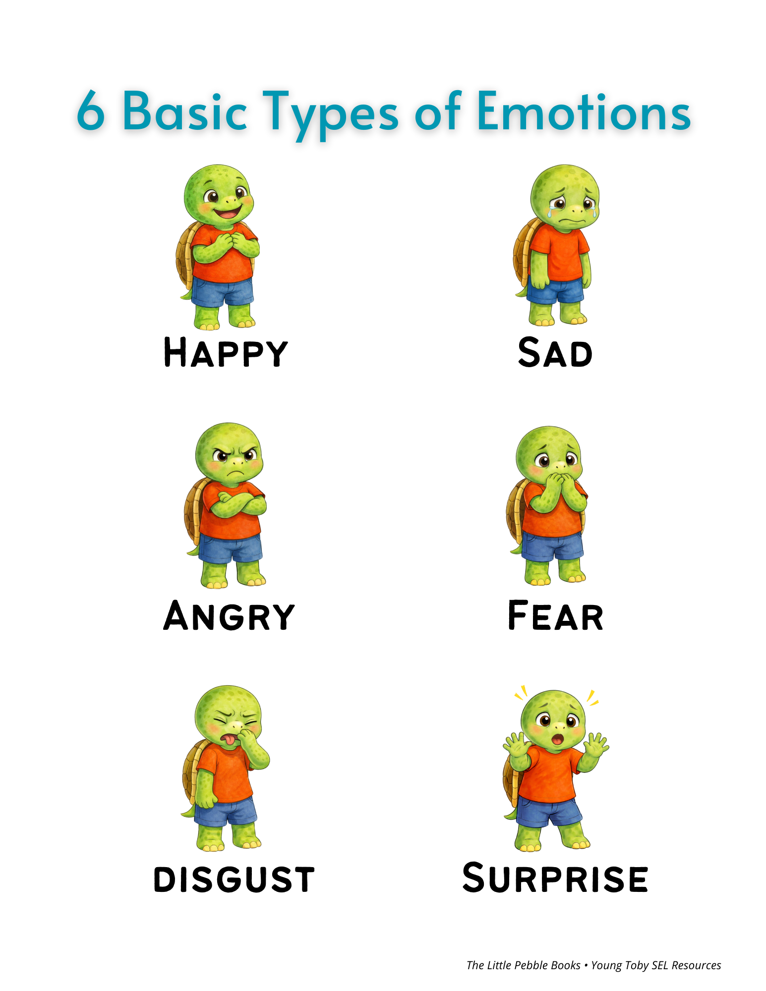 Six basic types of emotions — a visual reference for home, kitchen, or learning space. Helps children name what they feel.