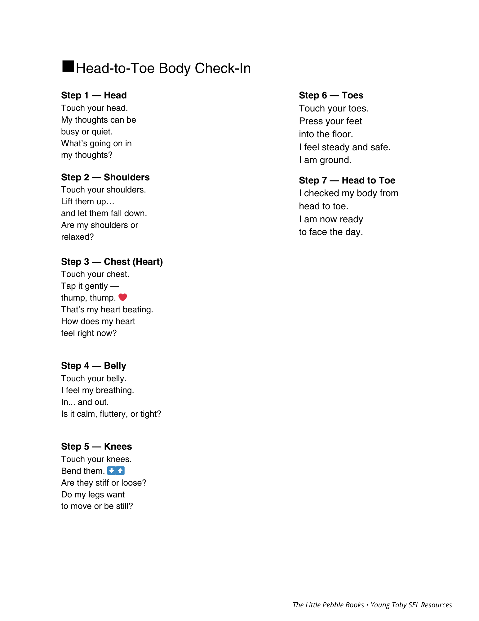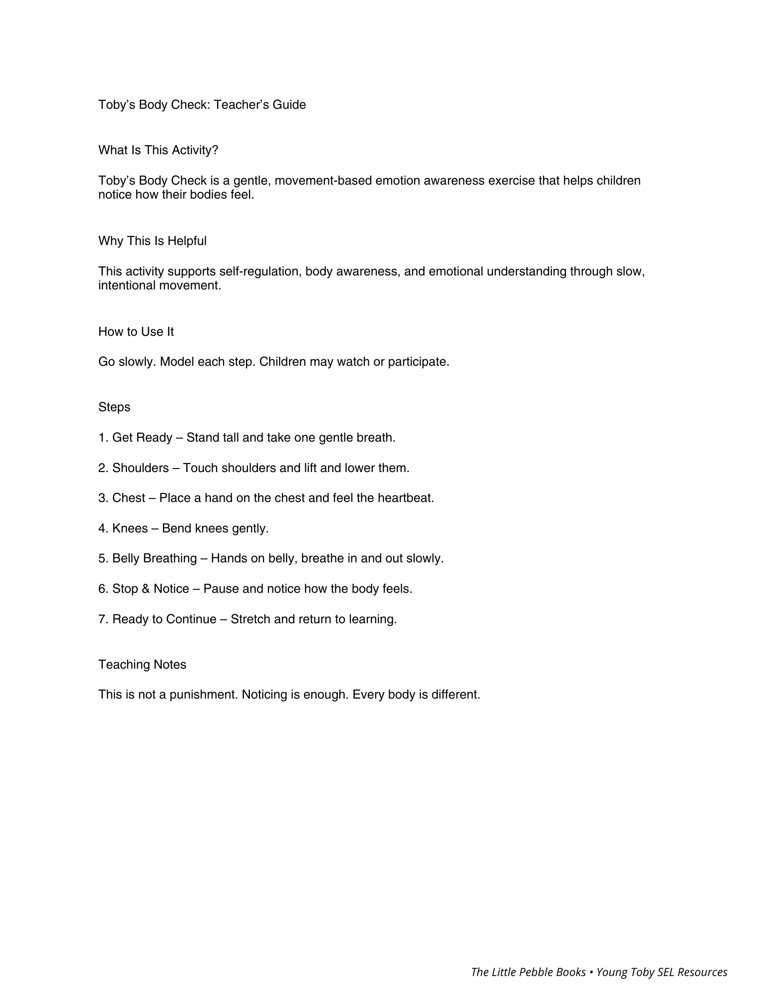 A somatic feelings check-in tool — children identify where they feel emotions in their body. Poster, guide, steps, and song included.