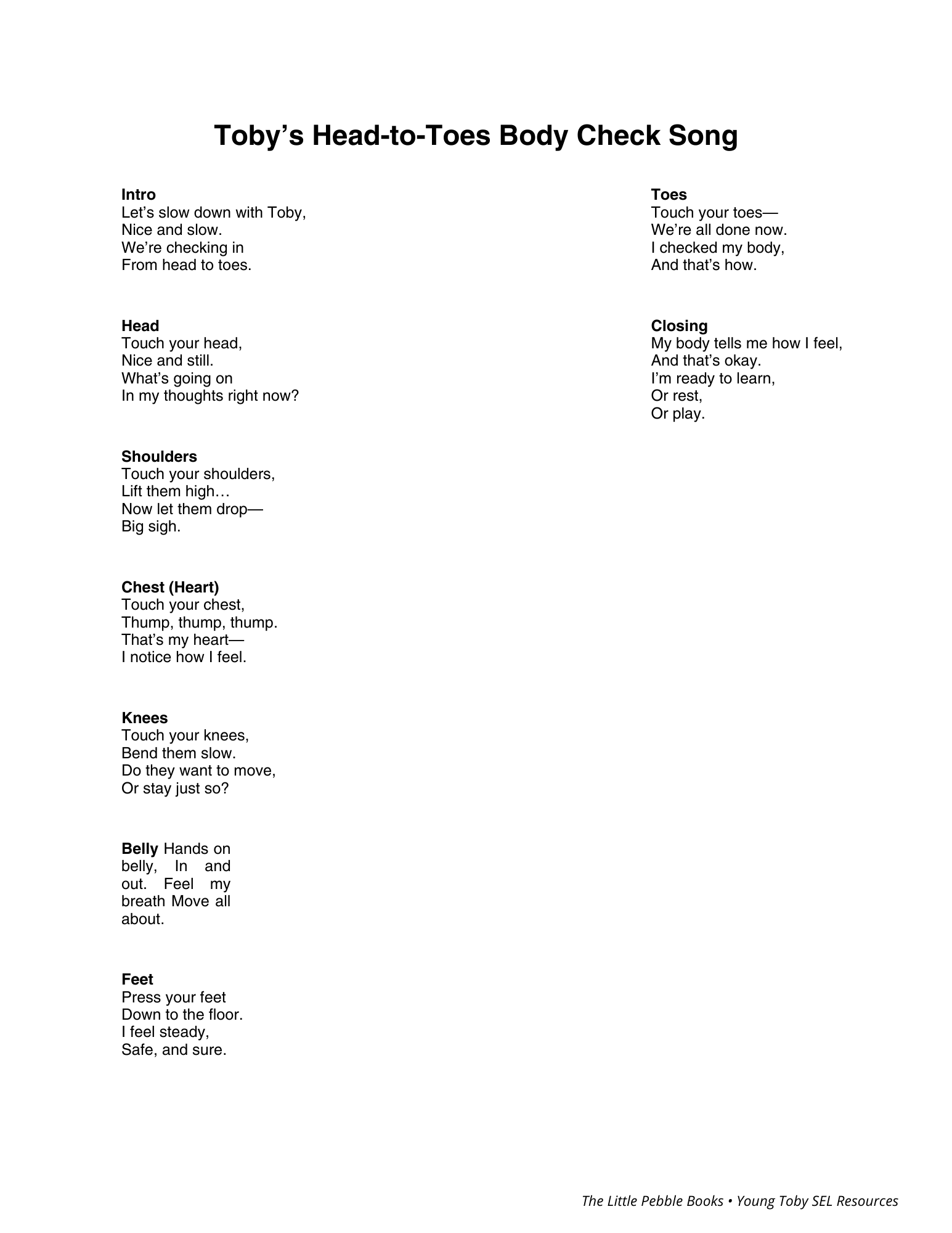 All 8 verses with movement cues — adapted for field use. You don’t need to sing it. Read it slowly, do the movements, and let the child watch. Especially useful for SROs and victim advocates.