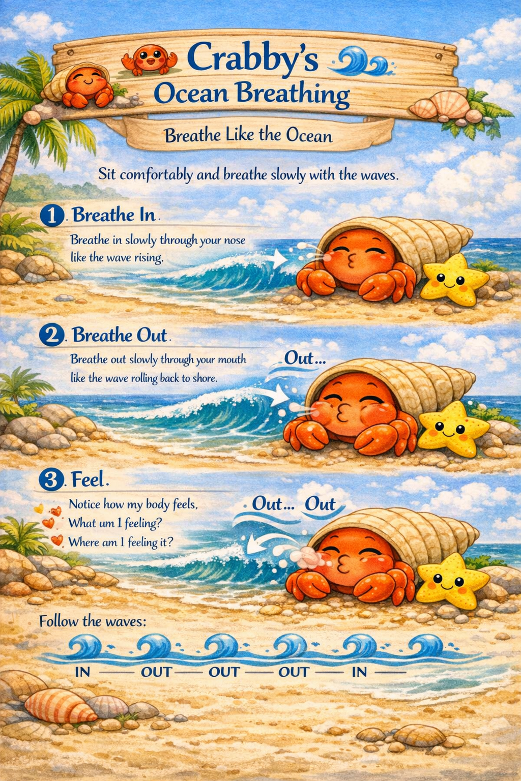 Breathe in like a wave rising, breathe out like a wave rolling back to shore. Poster and cards for session use.